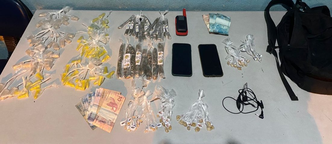 A Polícia Militar apreendeu no local 78 pinos de cocaína, 49 pedras de crack, 25 tiras de maconha, um rádio transmissor, dois celulares e R$ 210. No momento desta publicação, não havia informações sobre como ficou a situação dos suspeitos na delegacia. (Foto: Polícia Militar)
