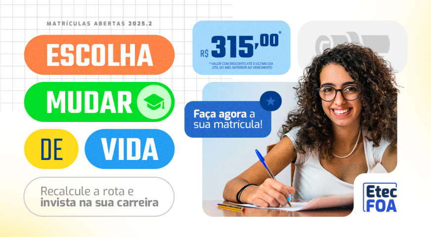 Está aberta a oportunidade para quem deseja investir no futuro profissional: a EtecFOA está com matrículas abertas para o Processo Seletivo 2025.2. Com uma proposta de ensino moderna, infraestrutura de ponta e cursos alinhados com as demandas do mercado, a escola técnica da Fundação Oswaldo Aranha oferece uma chance real de mudar de vida. Com o slogan “Escolha mudar de vida. Recalcule a rota e invista na sua carreira”, a campanha destaca não apenas a qualidade da formação técnica, mas também os diferenciais que tornam a EtecFOA uma das melhores opções da região para quem quer dar um passo à frente na carreira.