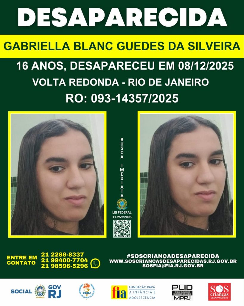 A adolescente Gabriella Blanc Guedes da Silveira, de 16 anos, de Volta Redonda, está desaparecida desde a última sexta-feira (5), quando saiu da Escola Municipal Rubens Machado, no bairro Vale Verde. Segundo a mãe, Thaiana Silva Blanc Guedes, ela assistiu às aulas normalmente e não retornou para a casa desde que saiu da unidade de ensino.