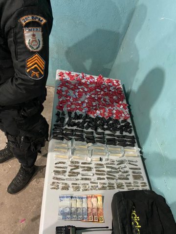 A PM informou que o adolescente portava uma mochila com 224 pinos de cocaína, 71 trouxinhas de maconha, um rádio transmissor e R$ 48. Os policiais disseram ainda que o comparsa do menor não foi encontrado.