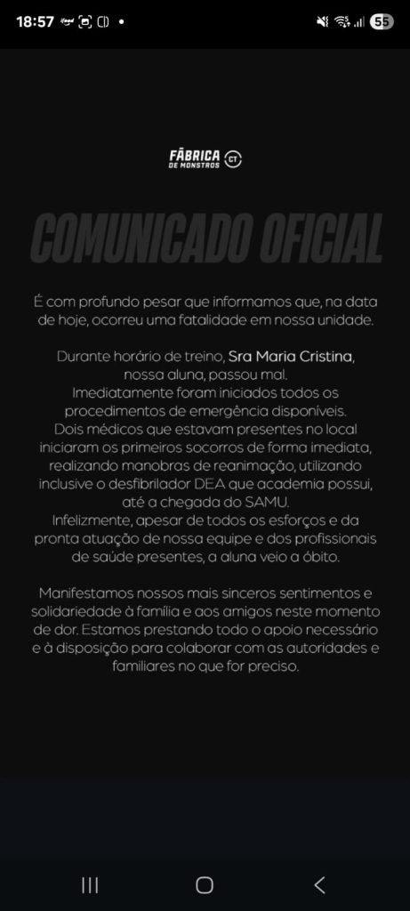 Segundo a Fábrica de Monstros CT, todos os procedimentos de emergência disponíveis foram utilizados, mas infelizmente ela acabou não resistindo. “Dois médicos que estavam presentes no local iniciaram os primeiros socorros de forma imediata, realizando manobras de reanimação, utilizando inclusive o desfibrilador DEA que academia possui, até a chegada do SAMU. Infelizmente, apesar de todos os esforços e da pronta atuação de nossa equipe e dos profissionais de saúde presentes, a aluna veio a óbito”, lamentou a academia, dizendo estar prestando todo o apoio necessário à família e à disposição para colaborar com as autoridades no que for preciso.
