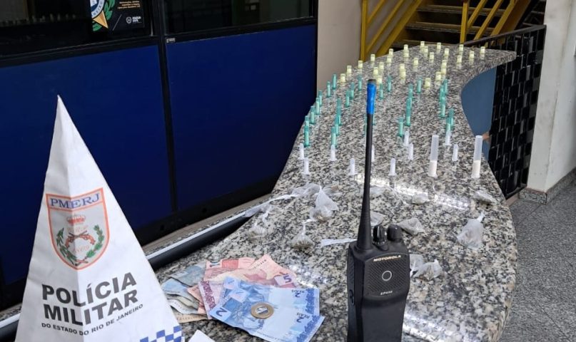 De acordo com a PM, os agentes do GAT II (Grupamento de Ações Táticas) estavam em diligências pela Rua Eduardo Junqueira quando abordaram o menor. A ação terminou com a apreensão de 73 pinos de cocaína, 15 trouxinhas de maconha, um rádio transmissor e uma folha de anotações para o tráfico, além de R$ 40. (Foto: PM/Divulgação)
