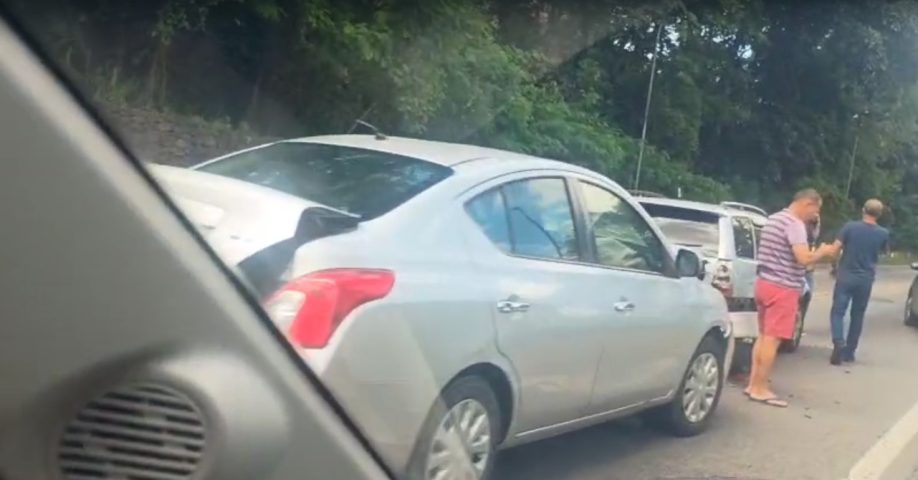 Uma batida traseira envolvendo dois carros deixa o trânsito lento, neste instante, no km 286 da BR-393 (Lúcio Meira), no Jardim Amália, em Volta Redonda. O acidente foi na pista sentido Vila Santa Cecília.