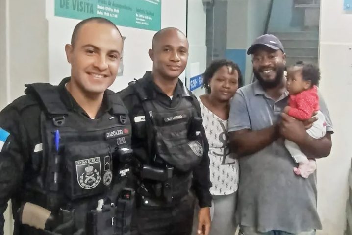Os agentes realizaram a Manobra de Heimlich para desobstruir a via aérea, fazendo a criança voltar a respirar. Em seguida, eles acompanharam os pais até o Hospital Nossa Senhora da Piedade, onde a bebê passou por exames e foi liberada. (Foto: Polícia Militar)