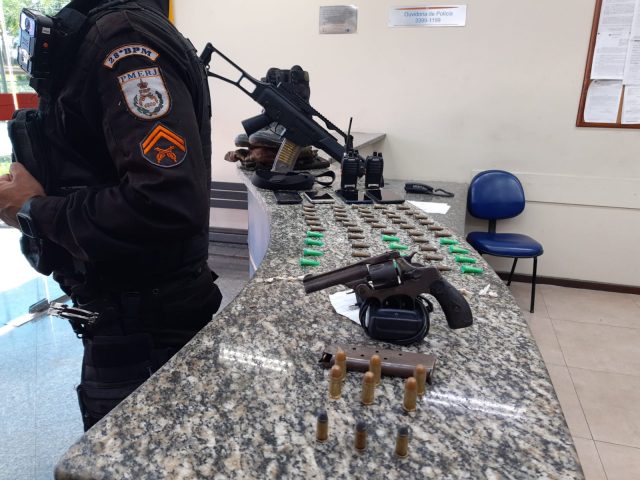A Polícia Militar apreendeu na terça-feira (28), no bairro Roselândia II, em Barra Mansa, um revólver calibre 38, uma réplica de fuzil e drogas. O material estava em uma casa na Rua 4 e o suspeito de ser o dono do material fugiu e não foi encontrado.