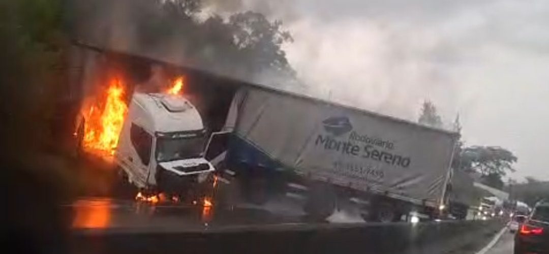 Caminhão pega fogo após bater em barranco na Dutra, em Barra Mansa