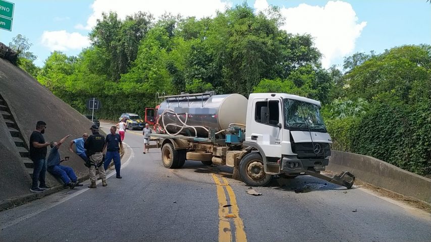 Um caminhão-tanque bateu em uma carreta no início da tarde deste domingo (19), na Dutra, em Barra Mansa. O acidente foi no retorno do km 282, no bairro Vila Ursulino.