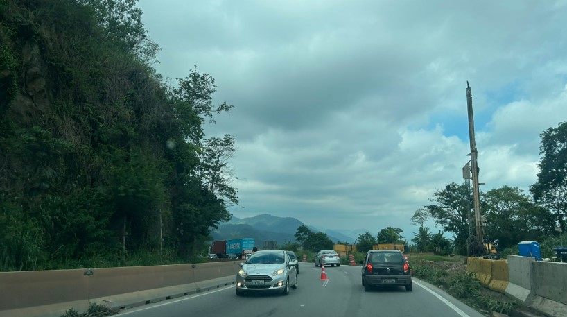 O trânsito na Via Dutra está congestionado desde a manhã deste sábado (20). O motivo é uma carreta transportando uma viga metálica de 30 metros de comprimento, que não conseguiu fazer uma curva. Até o momento desta publicação, o congestionamento se estendia pela pista sentido Rio, mesmo com a pista de subida operando em mão dupla há cerca de uma hora (foto abaixo).