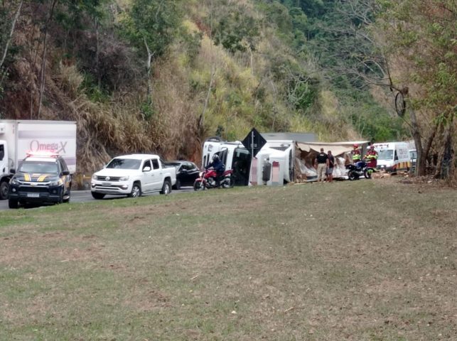 De acordo com a PRF, a carreta tombou na pista sentido Rio da Dutra, no km 222. Ninguém ficou ferido e parte da carga chegou a ser saqueada. A PRF informou que ocorre interdição parcial da via, com o trânsito fluindo pela direita. Os motoristas devem redobrar a atenção por conta do grande fluxo de veículos que ocorre neste período. (Foto: PRF/Divulgação)
