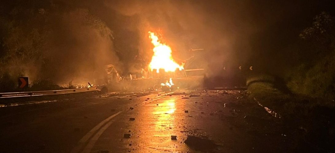 Carreta transportando óleo pega fogo em Sapucaia