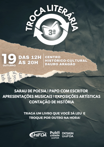 Dois anos de pandemia, uma edição online, e a primeira presencial, em 2019. Parece que foi ontem, mas o evento que contribui com a vasta oportunidade de enriquecimento da literatura está de volta. Nesse mês, dia 19 de outubro, acontece a III Troca Literária do UniFOA. Das 12h às 20h, os interessados poderão se encontrar no Centro Histórico-Cultural Dauro Aragão, no Campus Olezio Galotti, em Três Poços.
