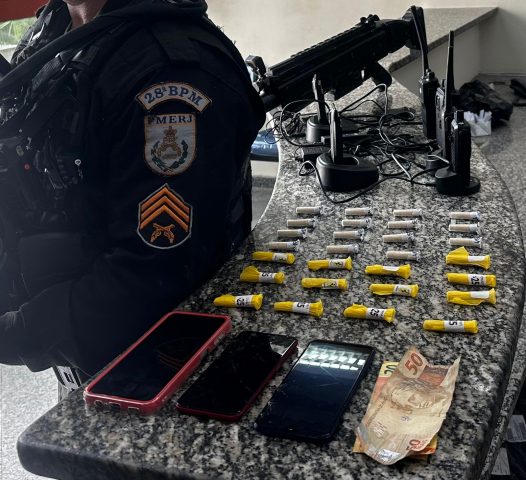 A PM informou que no cômodo os agentes encontraram quatro rádios transmissores, quatro baterias, 28 pinos de cocaína e uma réplica da arma. Questionados, o rapaz mais velho afirmou que o material era de sua propriedade.