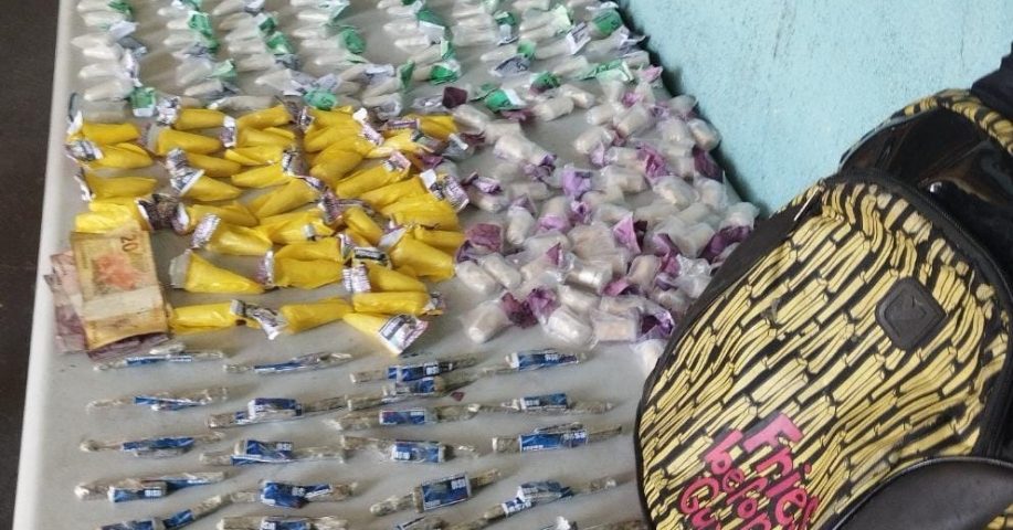 Com a dupla foram apreendidos 167 pinos de cocaína, 62 tambores da mesma droga, 74 pedaços de maconha e R$ 70. As drogas estavam em uma mochila. Os suspeitos e as drogas foram levadas para a delegacia, onde a ocorrência foi registrada. (Foto: PM/Divulgação)