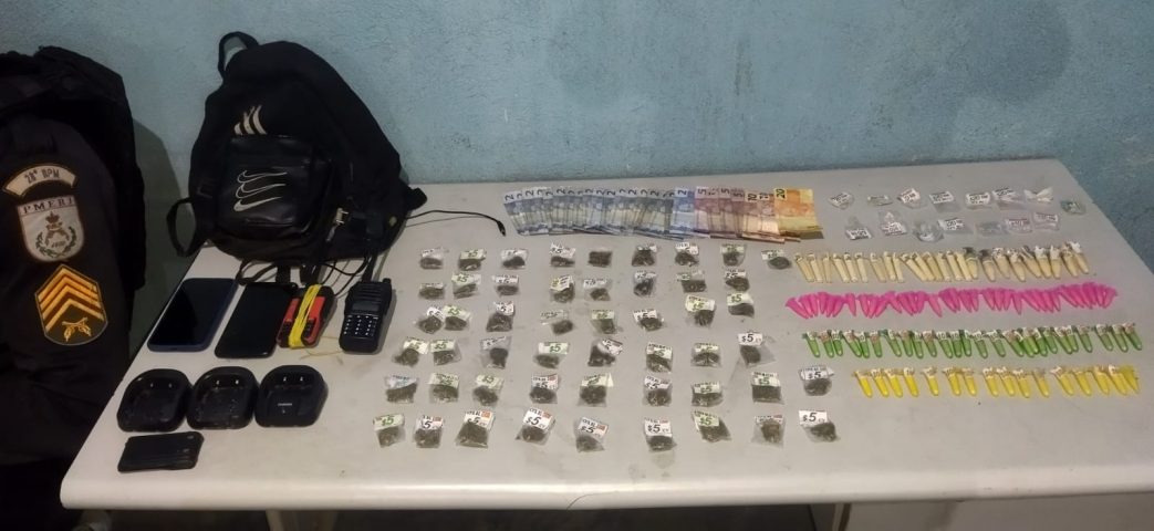 A Polícia Militar apreendeu com a dupla uma mochila preta contendo 98 pinos de cocaína, 51 pedaços de maconha, 15 pedras de crack, dois rádios transmissores e R$ 96.