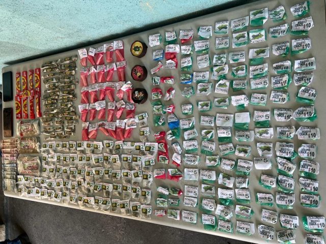 Policiais militares foram acionados para o local após informações de que a dupla estaria traficando na Servidão Unidade. Foi feito o cerco e, após uma tentativa de fuga dos suspeitos, eles foram capturados com 125 pedras de crack, 117 trouxinhas de maconha, 28 pinos de cocaína, dois celulares, nove papéis de seda, três objetos para esconder drogas e R$ 71. (Foto: PM/Divulgação)