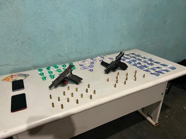 Foram apreendidos duas pistolas calibre 9 milímetros – uma delas com kit rajada -, 27 munições, dois carregadores, 58 pinos de cocaína e dois celulares, além de R$ 89.