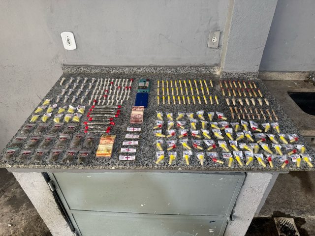 Foram apreendidos 235 pinos de cocaína, 29 trouxinhas de maconha e R$ 177 em espécie. A dupla foi encaminhada à delegacia de polícia, permanecendo presa. (Foto: polícia Militar)