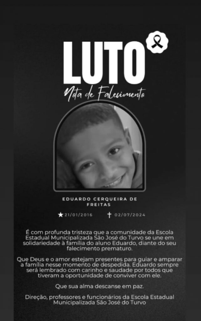 “É com profunda tristeza que a comunidade da Escola Estadual Municipalizada São José do Turvo se une em solidariedade à família do aluno Eduardo, diante de seu falecimento prematuro. Que Deus e o amor estejam presentes para guiar e amparar a família nesse momento de despedida. Eduardo sempre será lembrado com carinho e saudade por todos que tiveram a oportunidade de conviver com ele. Que sua alma descanse em paz”, lamentou o comunicado assinado pela direção, professores e funcionários da Escola Estadual Municipalizada São José do Turvo.