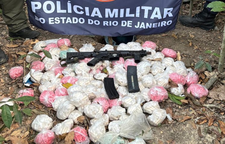 A Polícia Militar apreendeu na noite de sexta-feira (18), em Itatiaia, um fuzil, dois carregadores, 49 munições e 5.950 pinos de cocaína. O armamento e a droga estavam em um tonel enterrado em uma área de mata na Estrada de Furas, no bairro Campo Alegre.