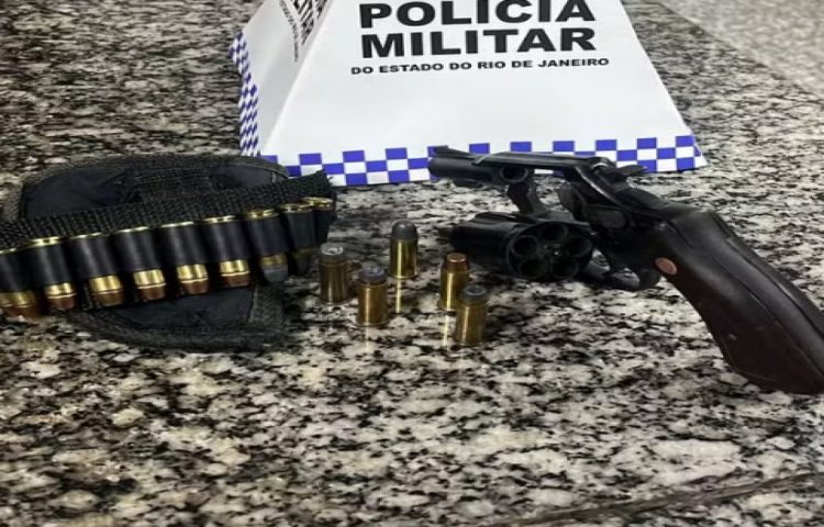 Um revólver com 17 munições intactas foi encontrado no local, além de um coldre. Ele foi levado para a delegacia da cidade, onde foi autuado pelos crimes, ficando à disposição da Justiça. (Foto: PM/Divulgação)