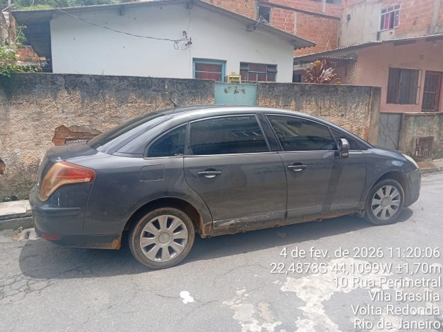 O carro que teria sido utilizado no crime foi encontrado momentos depois abandonado na Rua F, no bairro Vila Brasília, em Volta Redonda, com alguns documentos dentro. Buscas foram feitas, mas nenhum suspeito foi localizado. O veículo é um Citroen C4. Ainda não há informações se o carro é produto de roubo ou furto. Em consultas no sistema, os agentes verificaram que o baleado possui nove anotações criminais, sendo sete por furto, uma por tráfico e outra por receptação, entre 2018 e 2025. (Foto: PM/Divulgação)