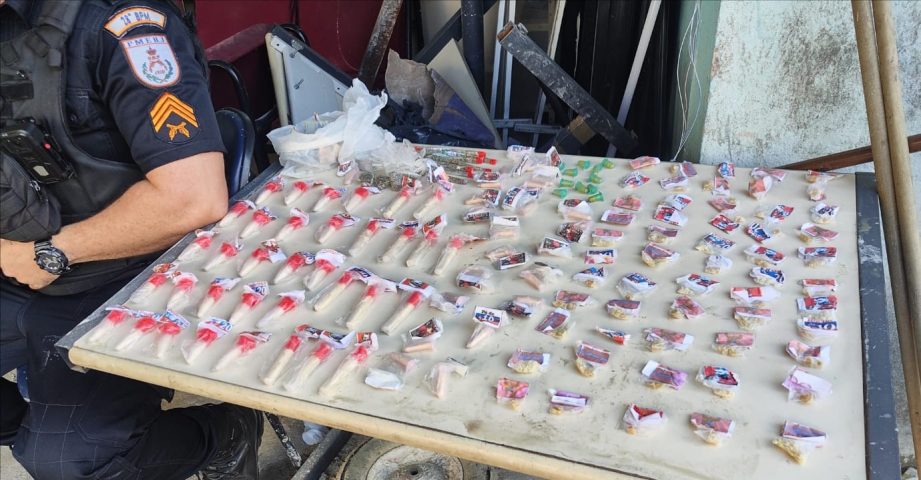 A PM realizava patrulhamento pelo local quando os agentes avistaram o suspeito em um escadão da localidade conhecida como ‘Grota’. Com ele foram apreendidos 66 pedras de crack, 59 pinos de cocaína, 10 pedaços de maconha e R$ 322. O material e o suspeito foram levados para a delegacia, onde a ocorrência foi registrada. (Foto: PM/Divulgação)