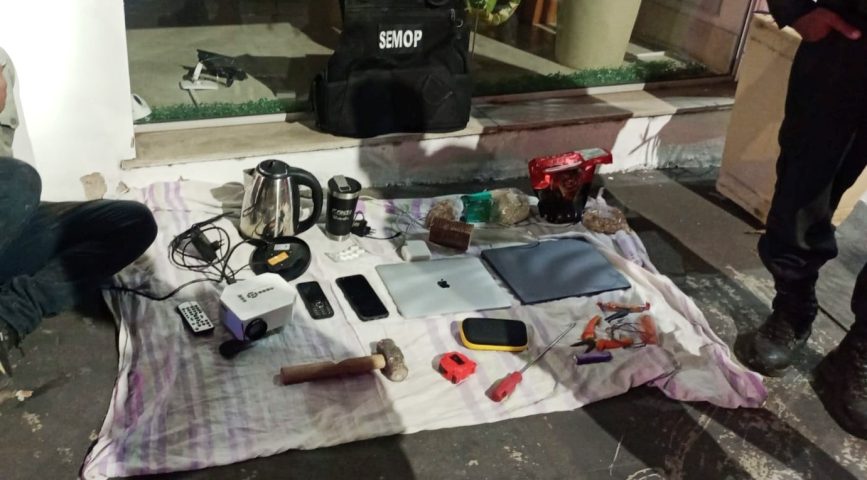 Ao perceber a chegada dos agentes, o suspeito tentou fugir pulando em quintais vizinhos, mas acabou sendo alcançado. Dentro da clínica foram encontrados objetos já separados para serem levados, como notebooks, celulares, jarra elétrica e projetor de imagens, além de ferramentas usadas para arrombamento, incluindo marreta, chave parafusadeira e alicate.