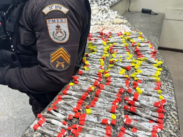 Com ele foram apreendidos 765 pinos de cocaína, 200 trouxinhas de maconha, 358 pedras de crack e 200 pinos vazios, além de material para embalar drogas, três cadernos com anotações do trágico e dois grampeadores.
