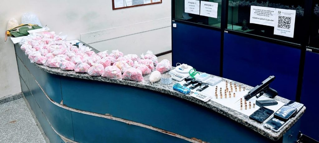 Os outros suspeitos presos têm21, 22 e 27 anos. Além da pistola com ste munições e do carro, foram apreendidos 2.650 pinos de cocaína, 700 gramas do mesmo entorpecente ainda não embalados, uma pedra de crack e grande quantidade de material para embalar entorpecentes.