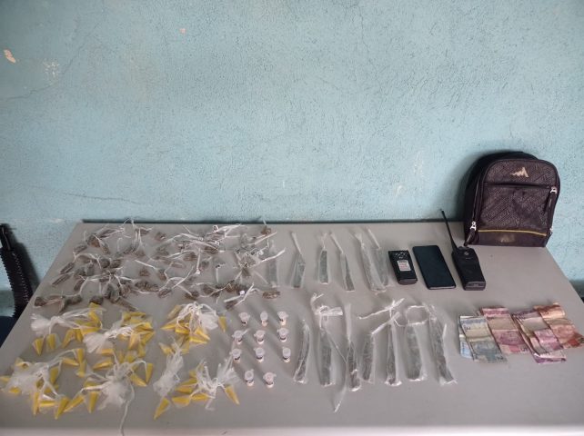Guarnições da Polícia Militar chegaram ao suspeito após denúncia de populares informando que ele estava na Rua G vendendo entorpecentes. Ele foi abordado e dentro de uma mochila foram encontrados 90 tiras de maconha, 79 pinos de cocaína, um rádio transmissor, um celular e R$ 73. (Foto: Polícia Militar)