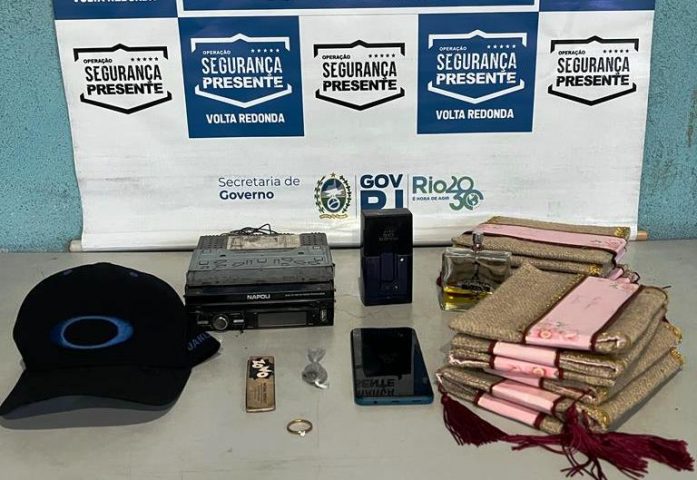 Agentes da Operação Segurança Presente em Volta Redonda prenderam, na segunda-feira (6), um jovem de 22 anos que furtou uma aliança e convites de casamento de um carro estacionado na Avenida dos Trabalhadores, na Vila Santa Cecília. O suspeito, que estava com diversas chaves de veículos, ainda foi pego com um DVD automotivo, um celular e um sacolé de maconha.