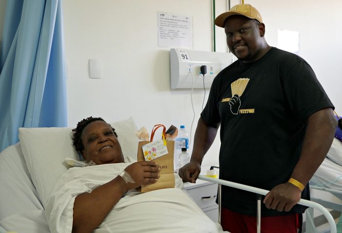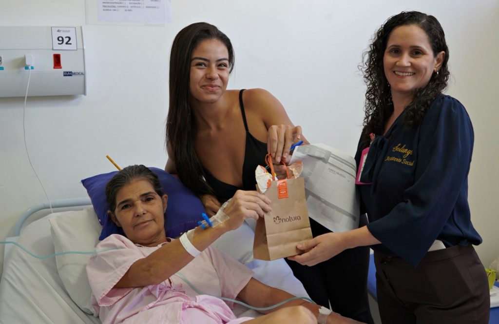 A aposentada Marilsa da Silva Pereira Sales, 57 anos, está internada há cinco dias, após apresentar sintomas de pneumonia. “Estou sendo bem tratada pela equipe de plantão, e estou me recuperando bem. Foi uma surpresa pra mim receber este presente. Esse carinho nos conforta”, disse ela, acompanhada da filha Mailla.