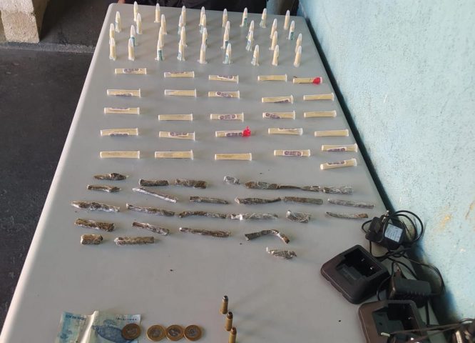 Uma sacola contendo 61 pinos de cocaína, 26 trouxinhas de maconha, um rádio transmissor e três bases para rádio foi apreendida na sexta-feira (18) no bairro São Lucas em Volta Redonda. O material foi encontrado na Rua Andrelândia, na localidade conhecida como Borelzinho.