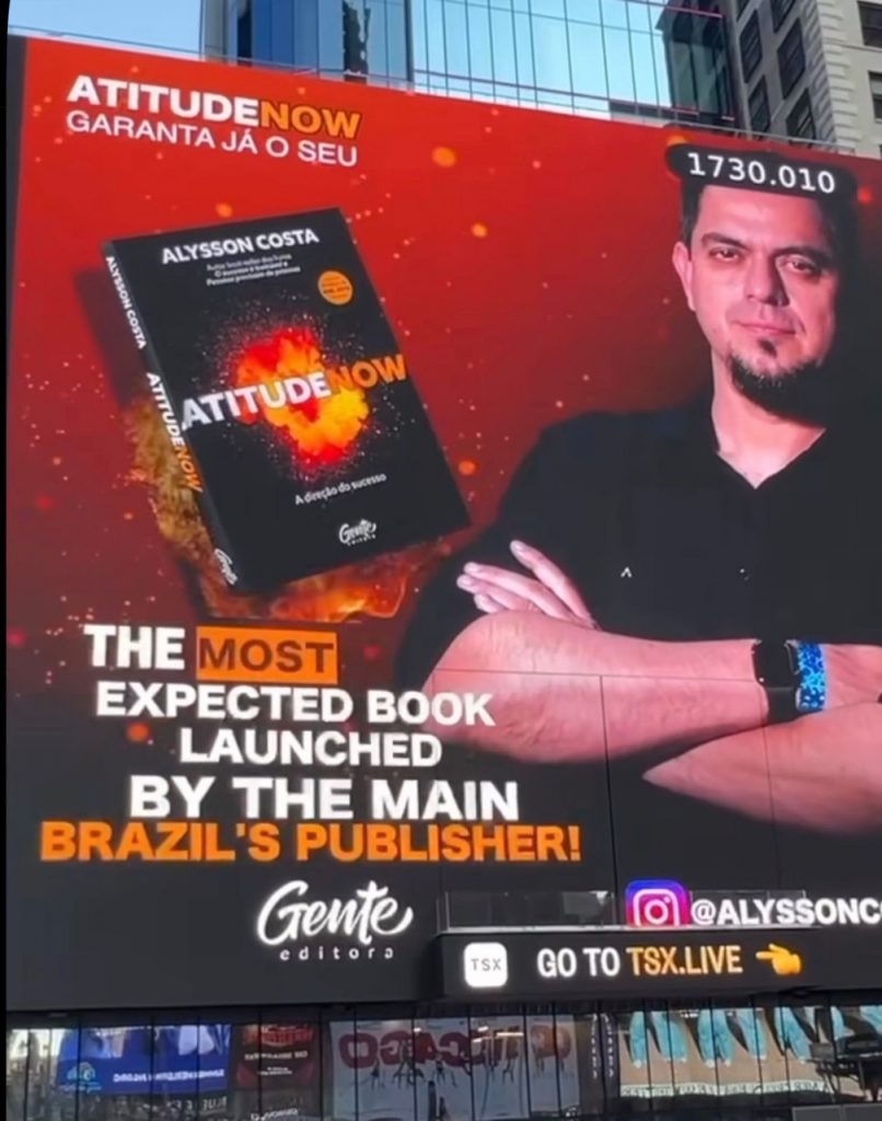 A Estreia nos Telões da Times Square – Natural de Barra Mansa, no interior do estado do Rio de Janeiro, Alysson Costa hoje está radicado em São Roque/SP. O lançamento de seu livro, “ATITUDENOW – A Direção do Sucesso,” nos telões da Times Square entrou para a história como um momento emblemático para a literatura brasileira. Alysson Costa se tornou o primeiro brasileiro na história a realizar esse feito extraordinário, compartilhando sua mensagem inspiradora com o mundo inteiro.