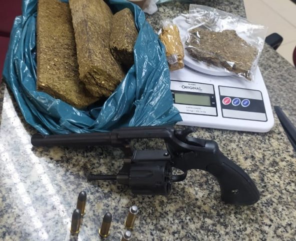 No local, os agentes apreenderam um revólver calibre 38 com numeração suprimida, cinco munições do mesmo calibre, quatro grandes tabletes e uma porção de maconha, balança de precisão e sacola com cerca de 500 pinos vazios.