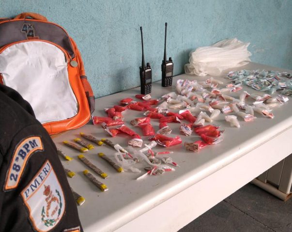 A guarnição da PM foi ao local checar denúncia de tráfico e se dividiram para realizarem o cerco. Os suspeitos tentaram fugir, mas foram alcançados. Com eles foram apreendidos 128 pinos de cocaína, 11 tiras de maconha, nove trouxinhas da mesma droga e dois rádios transmissores. A ocorrência era registrada na delegacia no momento desta publicação. (Foto: PM/Divulgação)