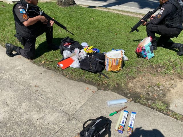 Agentes do Serviço Reservado e outros policiais seguiram para o endereço informado, onde encontraram cerca de meio quilo de pasta base de cocaína, 12 papelotes e três pinos de cocaína; duas embalagens de maconha embaladas à vácuo; 160 trouxas também de maconha, duas balanças digitais, quatro cadernos com anotações do tráfico e material para embalar drogas, além de uma capa de colete e duas placas balísticas de colete.