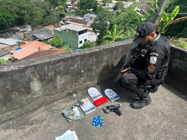 Além do material, os agentes encontraram com a dupla uma quantidade ainda não informada de drogas. Três balanças de precisão também foram apreendidas. Assim que chegar novas informações, a notícia vai ser atualizada. Na Colônia Santo Antônio, praticamente no mesmo horário, três suspeitos foram detidos com duas pistolas e munições. (Foto: PM/Divulgação)