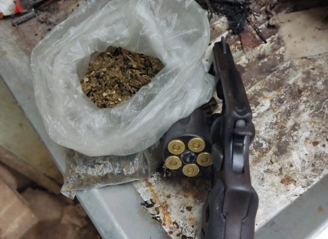 O revólver calibre 38 com cinco munições intactas foi encontrado com uma quantidade ainda não contabilizada de maconha. Ninguém foi preso. O material foi levado para a delegacia da cidade, onde a ocorrência foi registrada. (Foto: PM/Divulgação)
