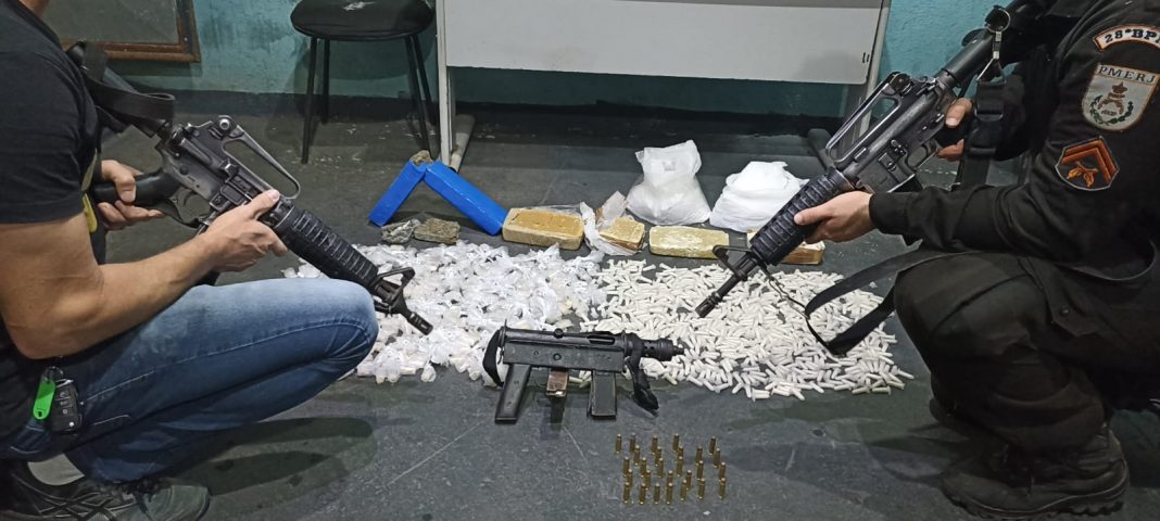 A rua onde o material foi encontrado não foi informada. Foram apreendidos dois sacos de cocaína (7kg), quatro tabletes da mesma droga (4kg), 1.038 pinos do entorpecente, três tabletes de maconha (2,5 kg), a submetralhadora, um carregador, e 27 munições calibre 38.
