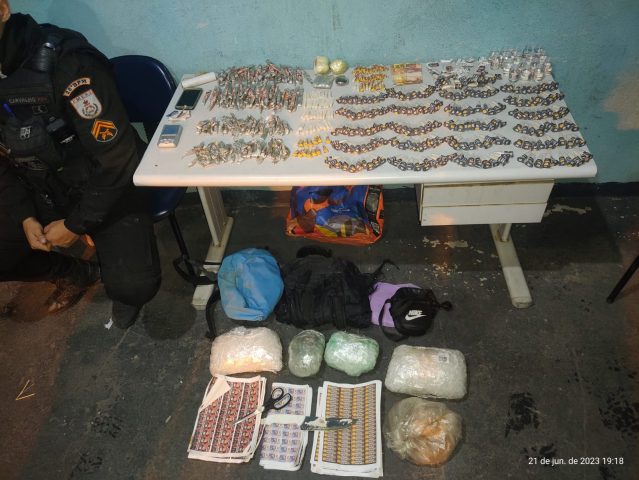 Ao flagrarem os suspeitos, os policiais se dividiram e realizaram um cerco. A dupla foi abordada com 315 pinos de cocaína, duas bolas da mesma droga, 194 pedaços de maconha, 90 pedras de haxixe, 17 pedras de crack, 17 frascos de loló, farto material para embrulhar drogas e R$ 100.