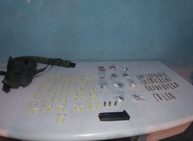 Os criminosos fugiram. Com apoio de uma equipe do GAT (Grupamento de Ações Táticas), que seguiu para o bairro em reforço, foram feitas buscas por suspeitos, quando foram encontrados 62 pinos de cocaína, 46 pedaços de maconha, um carregador calibre 9mm e três munições intactas do mesmo calibre. (Foto: Polícia Militar)