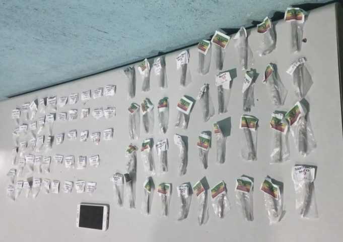 Guarnições do GAT (Grupamento de Ações Táticas) e Serviço Reservado da Polícia Militar chegaram até o suspeito após informações de tráfico de drogas no local. Com ele foram apreendidos 25 pinos de cocaína, 23 pedras de crack, 37 tiras de maconha e um celular. (Foto: Polícia Militar)