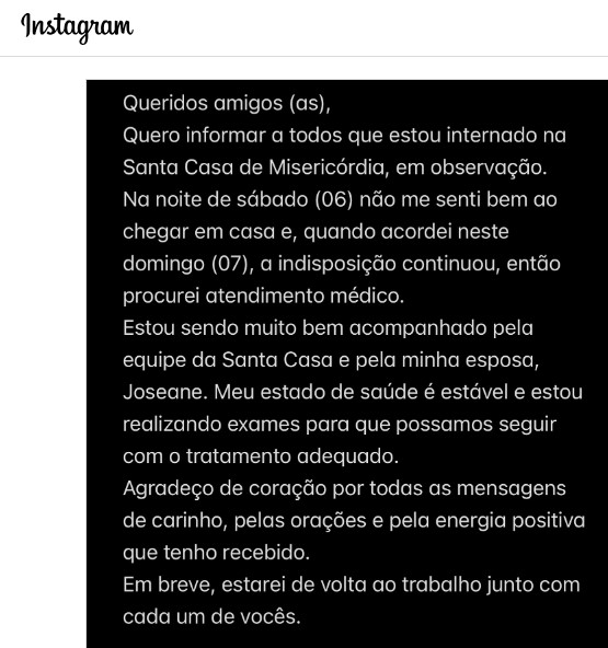 Após a publicação da notícia sobre sua internação, o prefeito publicou em uma rede social uma nota (veja abaixo) na qual afirma que não se sentiuu bem ao chegar em casa, na noite do sábado (6) ,e que a indisposição prosseguiu na manhã deste domingo, quando resolveu procurar atendimento médico. Ele confirmou que passou por uma série de exames.