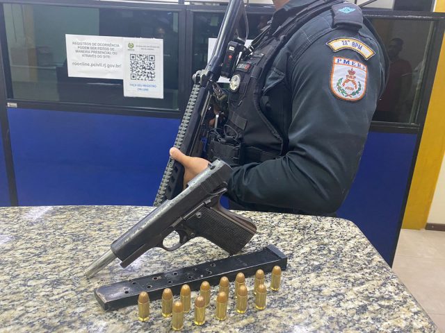 A Polícia Militar chegou até os suspeitos após denúncias de que eles estavam vendendo drogas e portando armas. Em revista, uma pistola calibre .45 com carregador alongado foi apreendida com um deles.