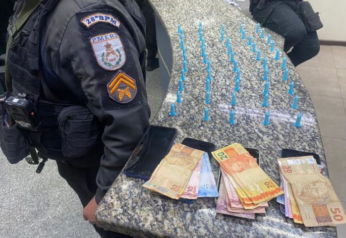 Na Rua Joaquim Cândido Bastos, no bairro São Genário, foram presos um homem de 35 anos e um rapaz de 22. Os agentes apreenderam com a dupla 90 pinos de cocaína, uma arma caseira, um par de algemas e R$ 120.