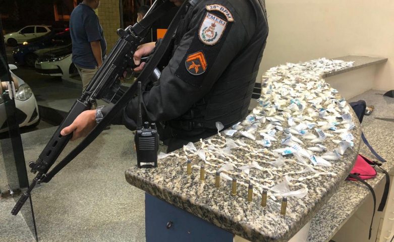 Dentro da mochila do suspeito, os policiais encontraram 96 trouxinhas de maconha, 154 pedras de crack, 129 pinos de cocaína, 1 rádio de comunicação e 7 munições calibre 38.