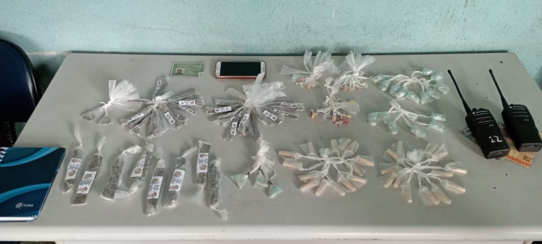 Os agentes chegaram até o trio – de 15, 18 e 21 anos – depois de receberem denúncias. Ao perceberem a presença das guarnições, eles tentaram fugir, mas foram alcançados. Com eles foram apreendidos 46 pinos de cocaína, 34 pedaços de maconha, 27 pedras de crack, dois rádios transmissores, um caderno com anotações do tráfico, um celular e R$ 177. (Foto: PM/Divulgação)