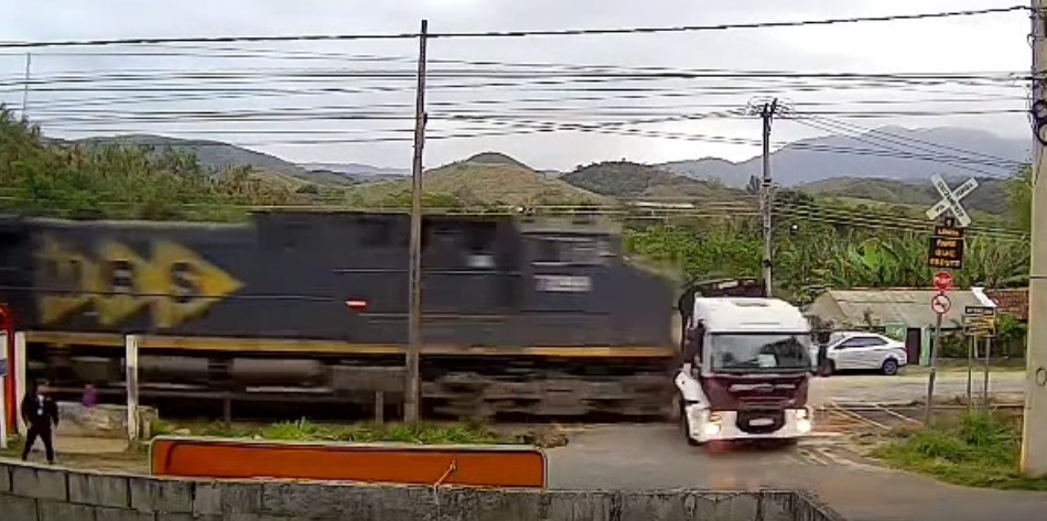 Uma câmera de segurança registrou o momento em que um caminhão foi atingido por um trem ao tentar cruzar a passagem de nível do bairro Ipiranga, no limite de Vassouras com Barra do Piraí. O acidente ocorreu na tarde desta terça-feira (23).