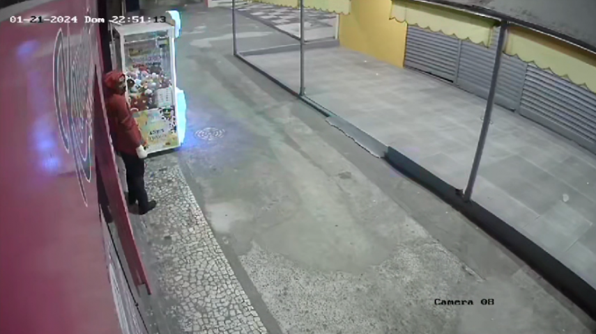 Imagens disponibilizadas pelo proprietário mostra quando o ladrão entra o no local. Vestindo uma blusa moletom laranja com capuz e calça jeans, ele não se intimida com a presença de câmeras. O vídeo mostra o criminoso forçando a porta, dando meia volta para ver se não havia ninguém por perto e entrando facilmente na loja.